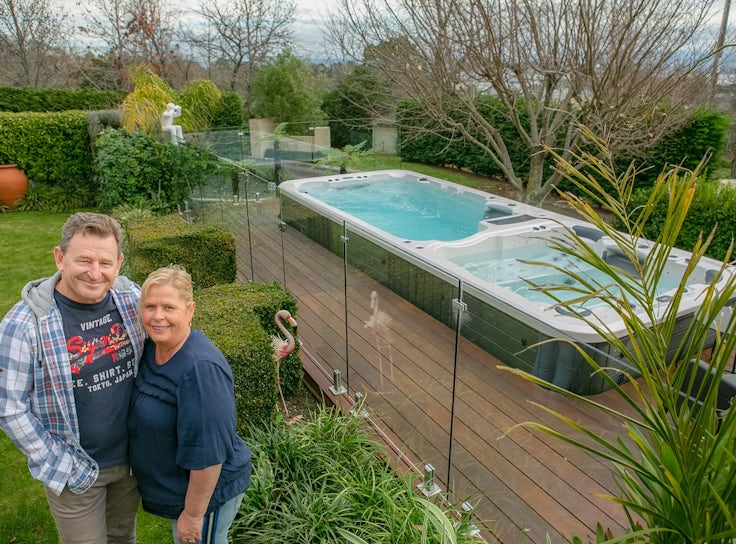 Looking for backyard design inspiration? This couple installed a swim spa in a deck on a sloping site and the resuls are stunning. Check out the finished installation and read their design and build story below. Vortex Hydrozone Pro+™ with Coastal Grey Cabinet and Gypsum Shell.