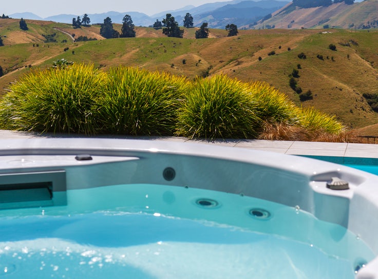 Fisher® Orbit™ overlooks rolling Wakefield, NZ hills, creating a peaceful setting for premium outdoor soaking.