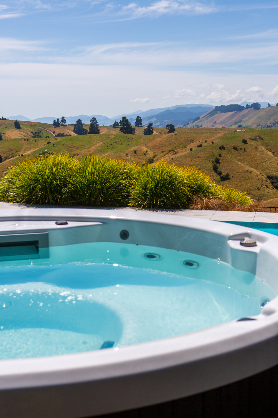 Fisher® Orbit™ overlooks rolling Wakefield, NZ hills, creating a peaceful setting for premium outdoor soaking.
