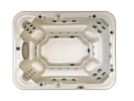 This model includes Hydroflow™ stainless steel jets, Hydroglow™ backlit drink holders, Hydroglow™ jet and topside control lighting, perimeter and cabinet lighting, Hydroglow™ backlit laminar jets, dual layer insulation, Purezone™ UV water purifier, and timber-free Permaframe™ construction.